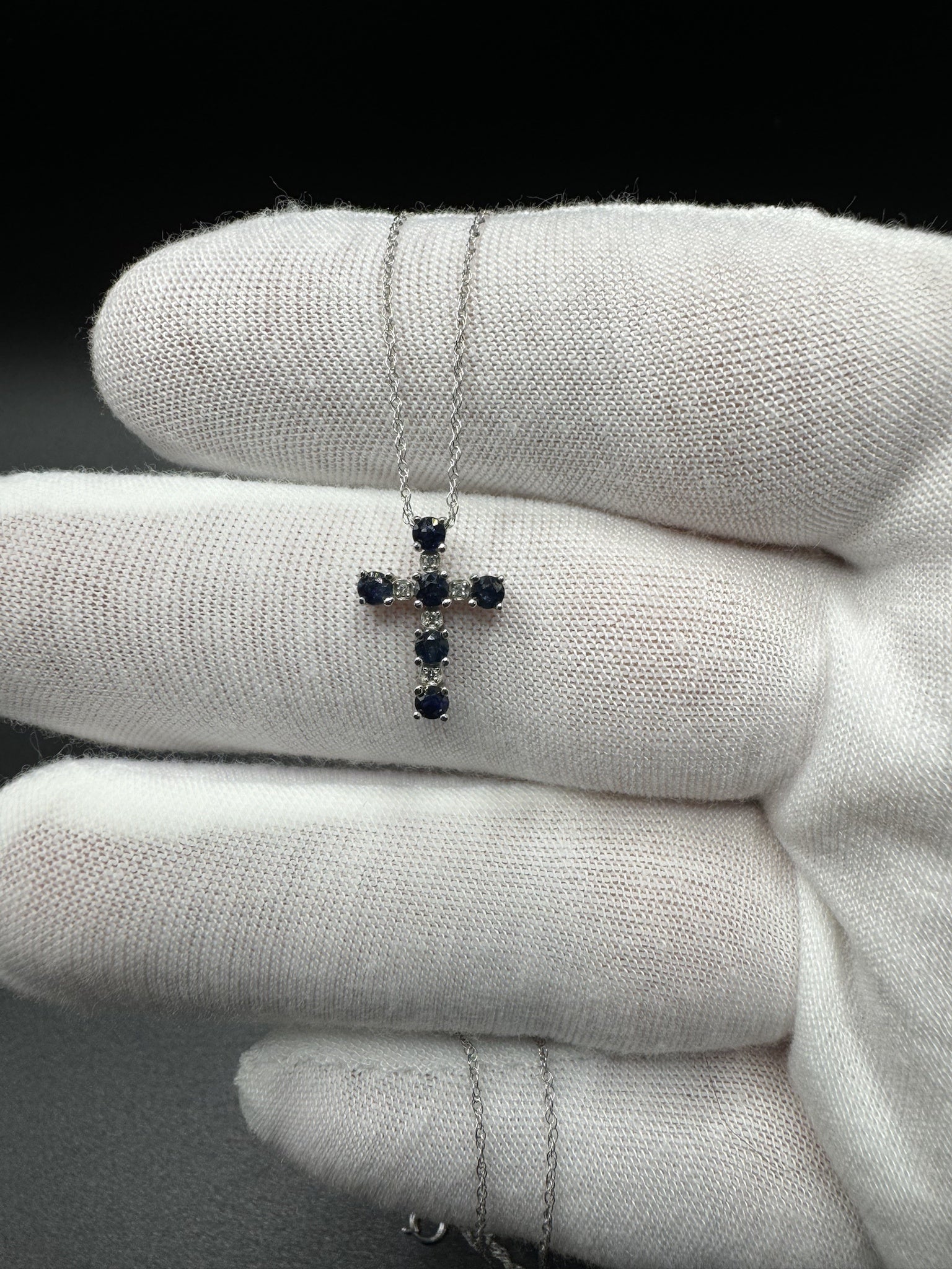 18” 10k White Gold Chain & 1/2” Natural Diamond and Blue Sapphire Cross 1.5g