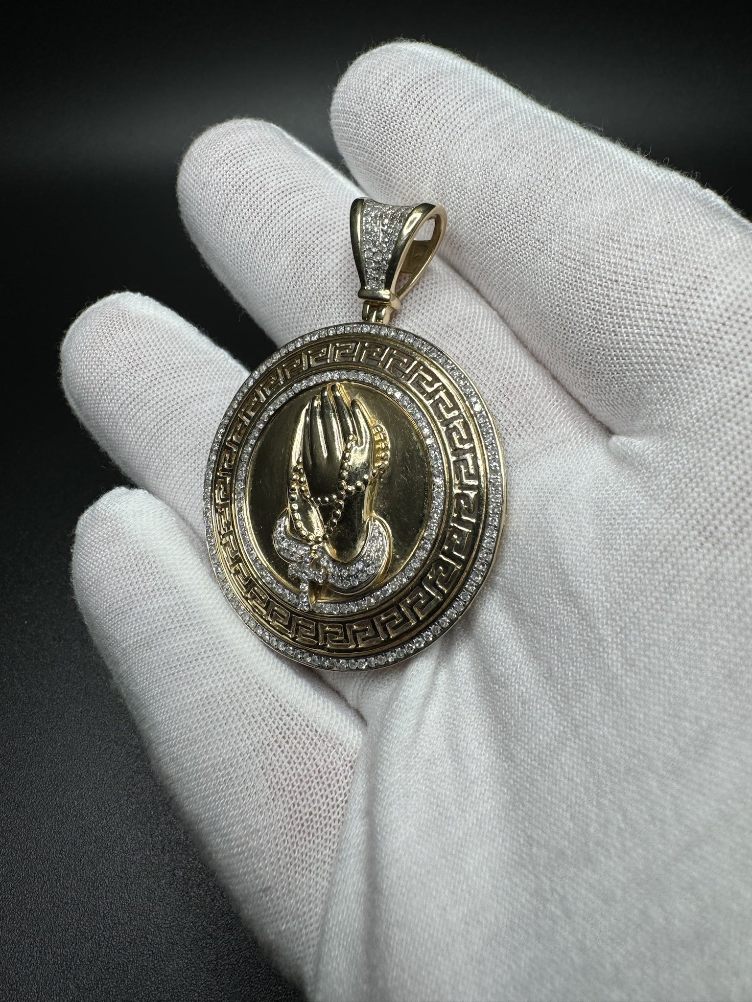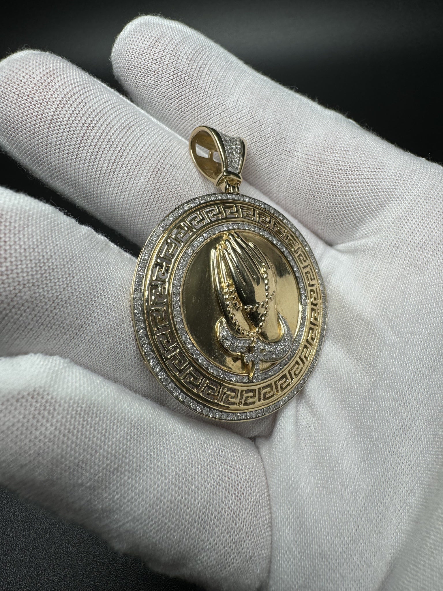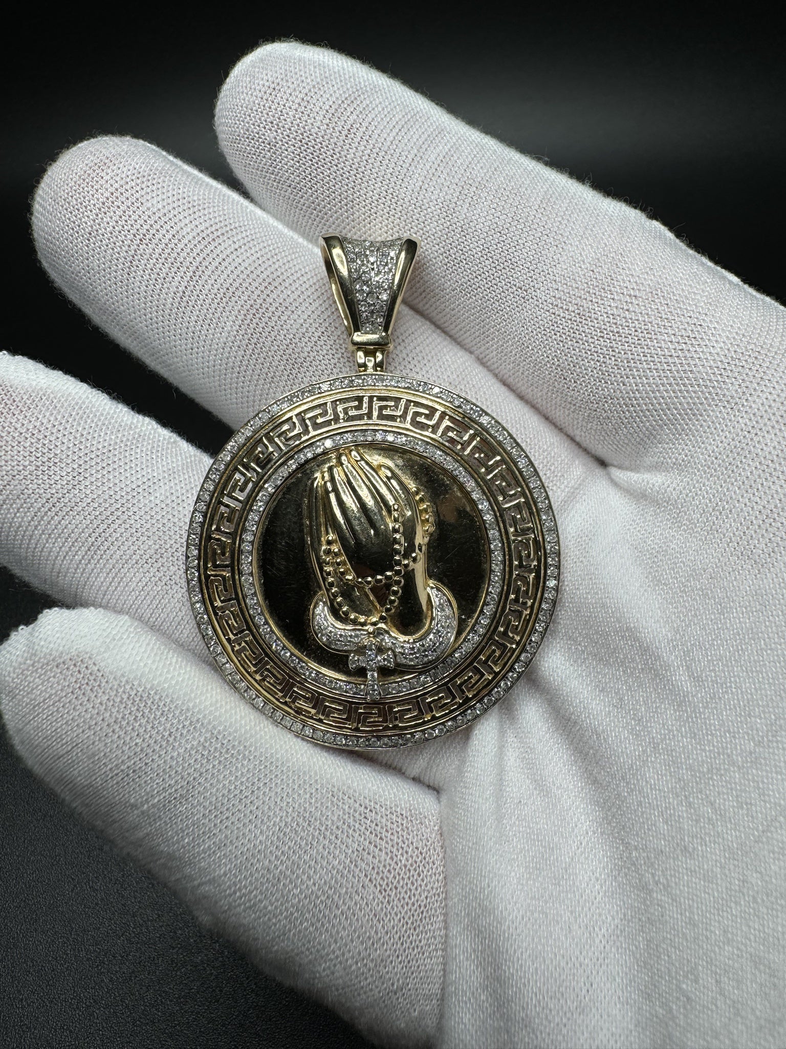 2” 14k Yellow Gold Circular Greek Praying Hands with Rosary est 1ctw Natural Diamonds 6mm Bail 13.2g
