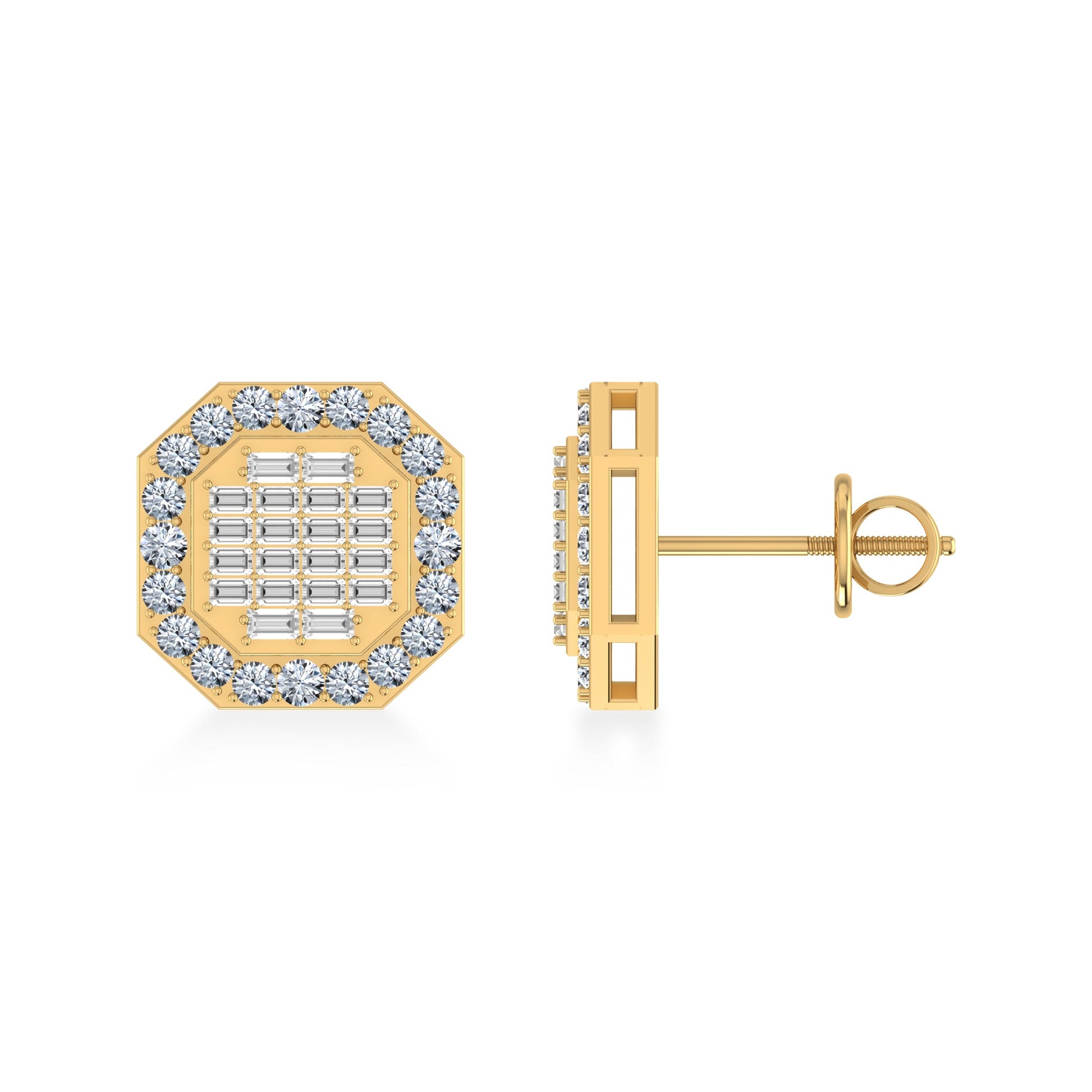 14K Yellow Gold Round Baguette Diamond Designer Stud Earrings 7/8 Cttw