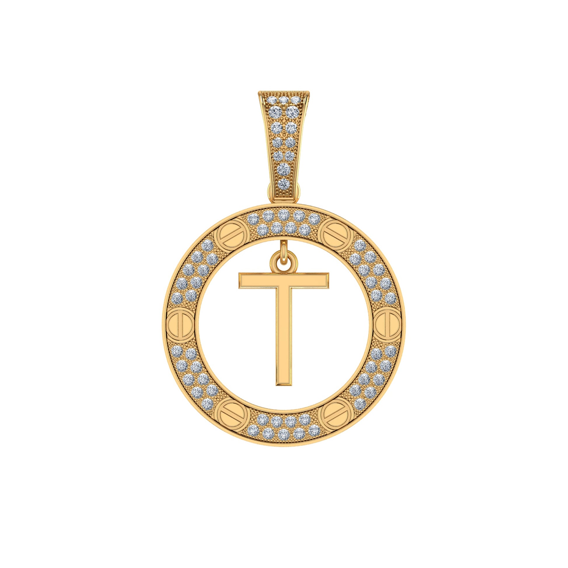 10K Yellow Gold Round Diamond T Letter Initial Pendant 1/5 Cttw