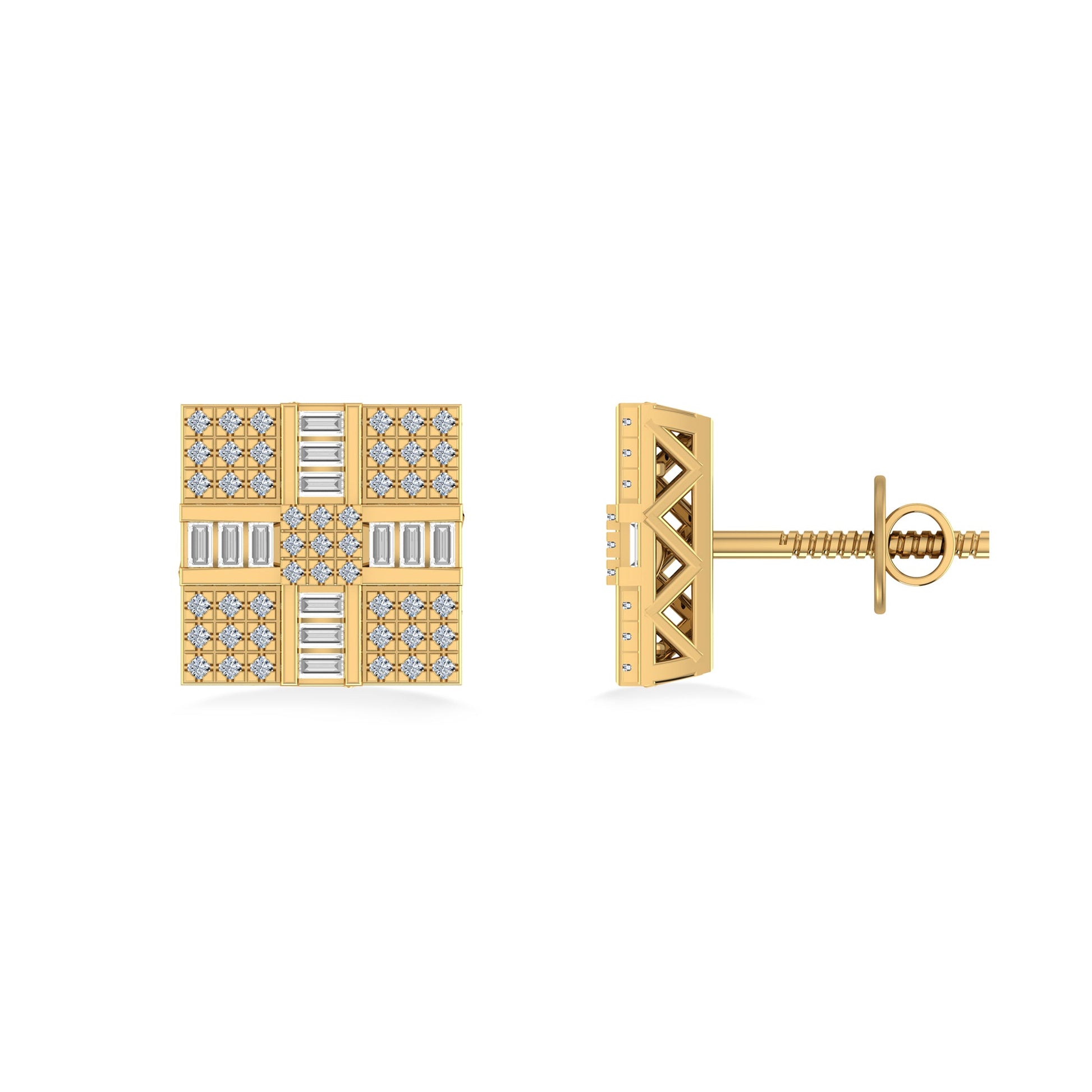 10K Yellow Gold Round Baguette Diamond Square Shape Designer Mens Stud Earring 1/3 Cttw
