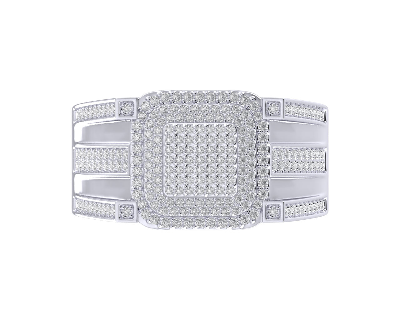 Bold and refined, this open-side prong diamond ring showcases clean lines and sharp details. The elevated square face is fully flooded with prong set diamonds, while four corner prongs each hold a single brilliant accent diamond stones. The open-bar side design adds an architectural twist, giving the ring a unique and modern profile.