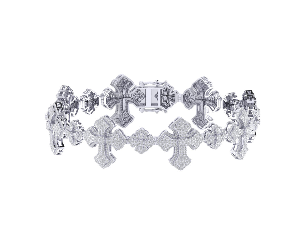 Turn heads with this commanding religious bracelet featuring bold Gothic style cross links. Each cross is meticulously encrusted with brilliant prong set diamonds, delivering a radiant sparkle that contrasts beautifully against the polished white metal backdrop. The robust design is both spiritual and fashion-forward, secured with a sturdy box clasp for daily wear or special occasions. Perfect for those who embrace powerful symbolism with striking style.
