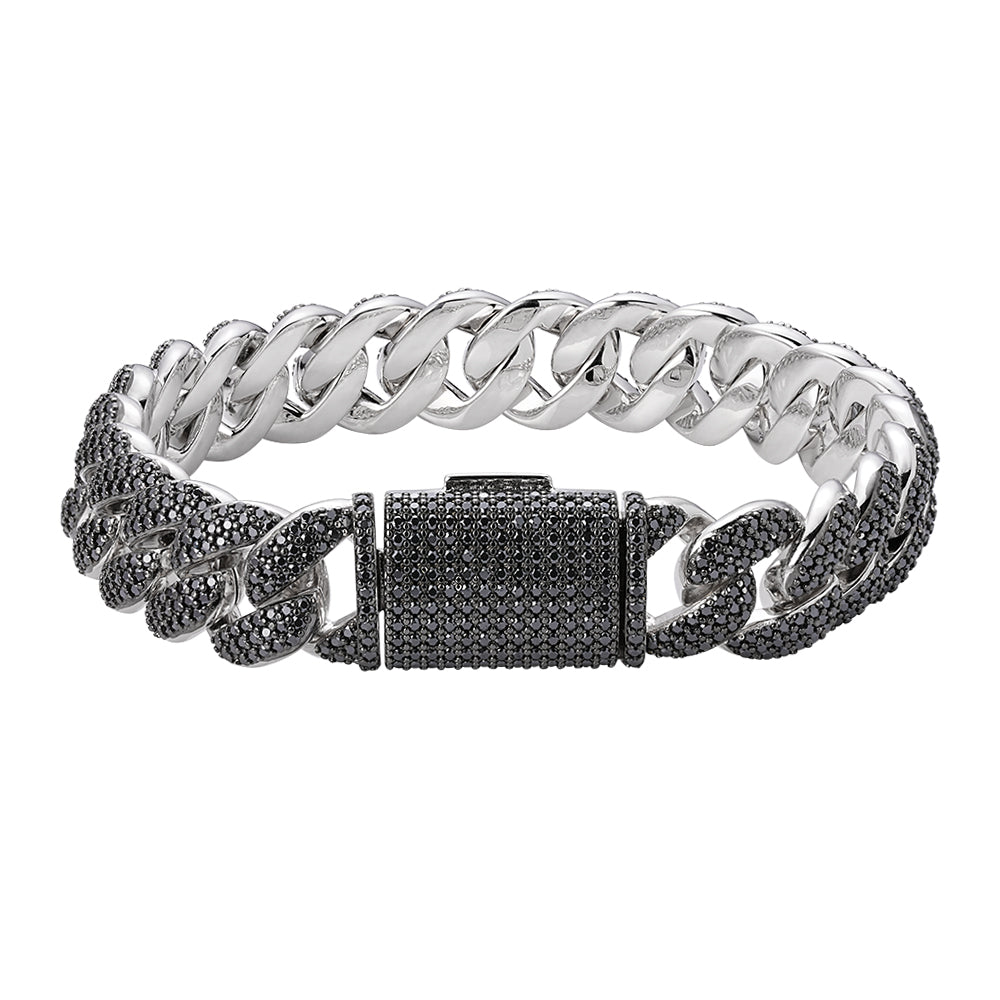 Sterling Silver 15mm Round Black Moissanite Miami Cuban 8 Inch Mens Bracelet RP+BP 12-1/10 Cttw