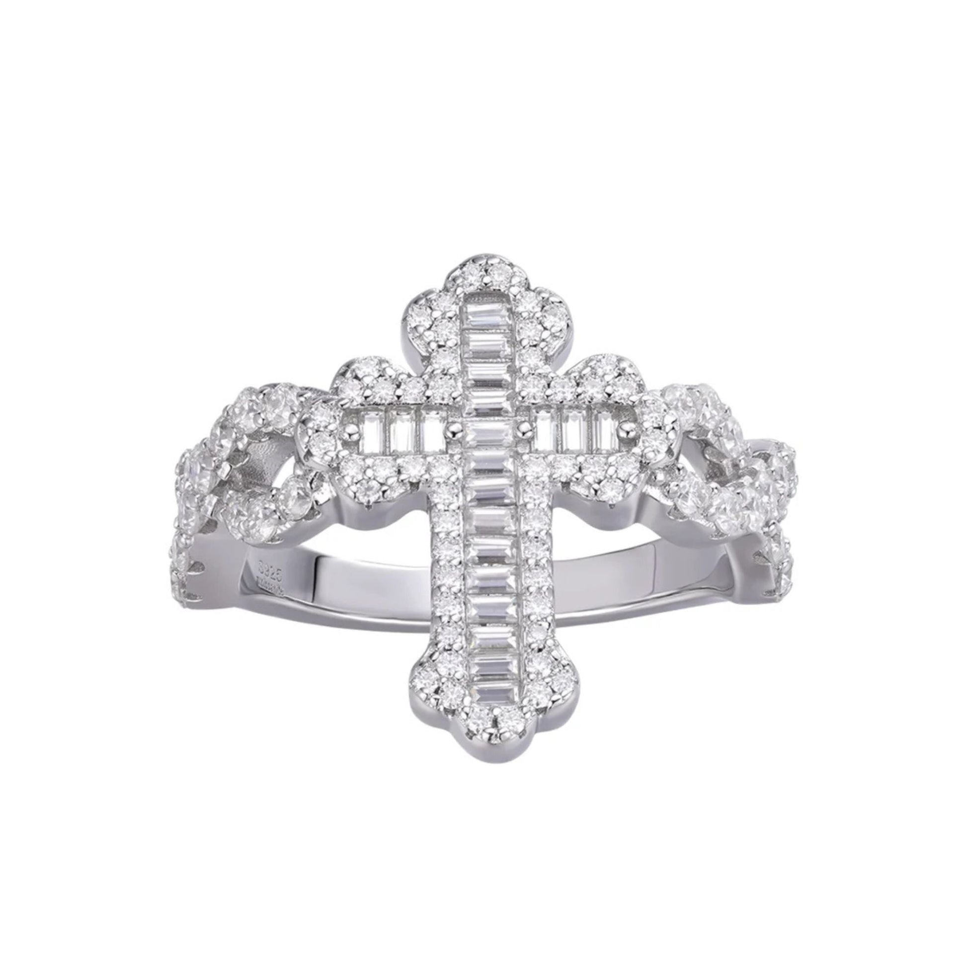 Sterling Silver Round Baguette Moissanite Cross Religious SZ 9 Ring RP 1-5/8 Cttw