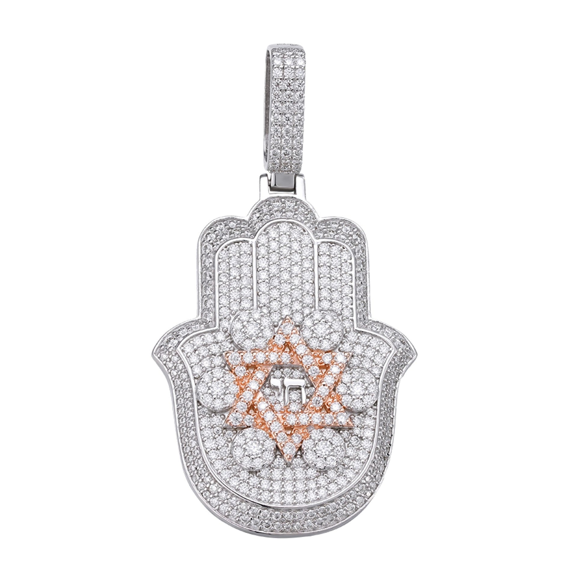 Sterling Silver Round Moissanite Hamza Hand Religious Pendant RP+PP 3-5/8 Cttw