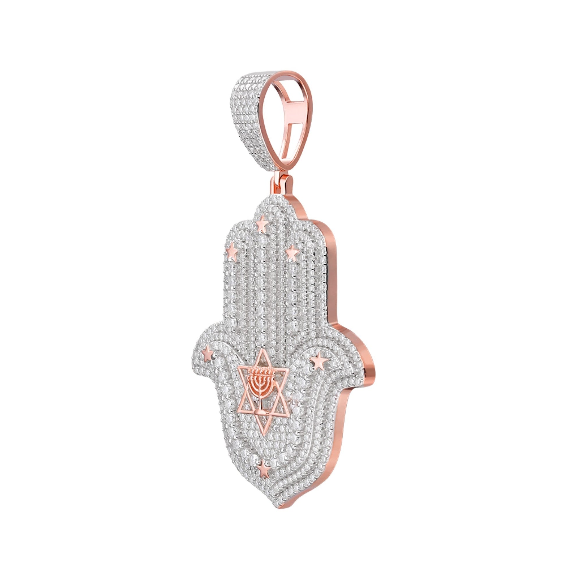 Sterling Silver Round Moissanite Hamza Hand Religious Pendant RP+PP 4-5/8 Cttw