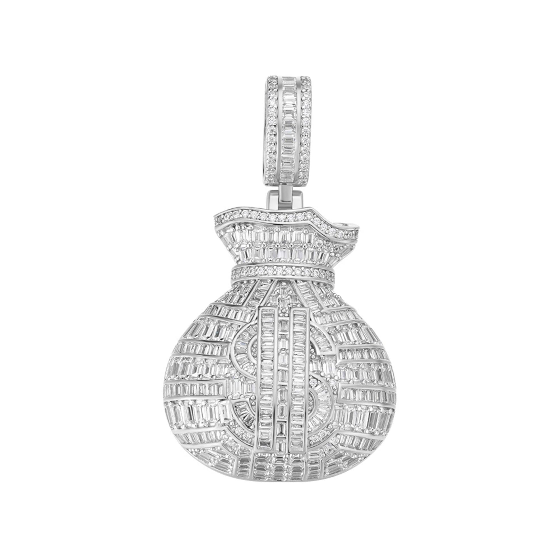Flex your grind and success with this money bag pendant, fully iced and designed for maximum shine. The bold $ dollar sign centerpiece combined with rows of handset round baguette stones creates a premium, high-luxury look.