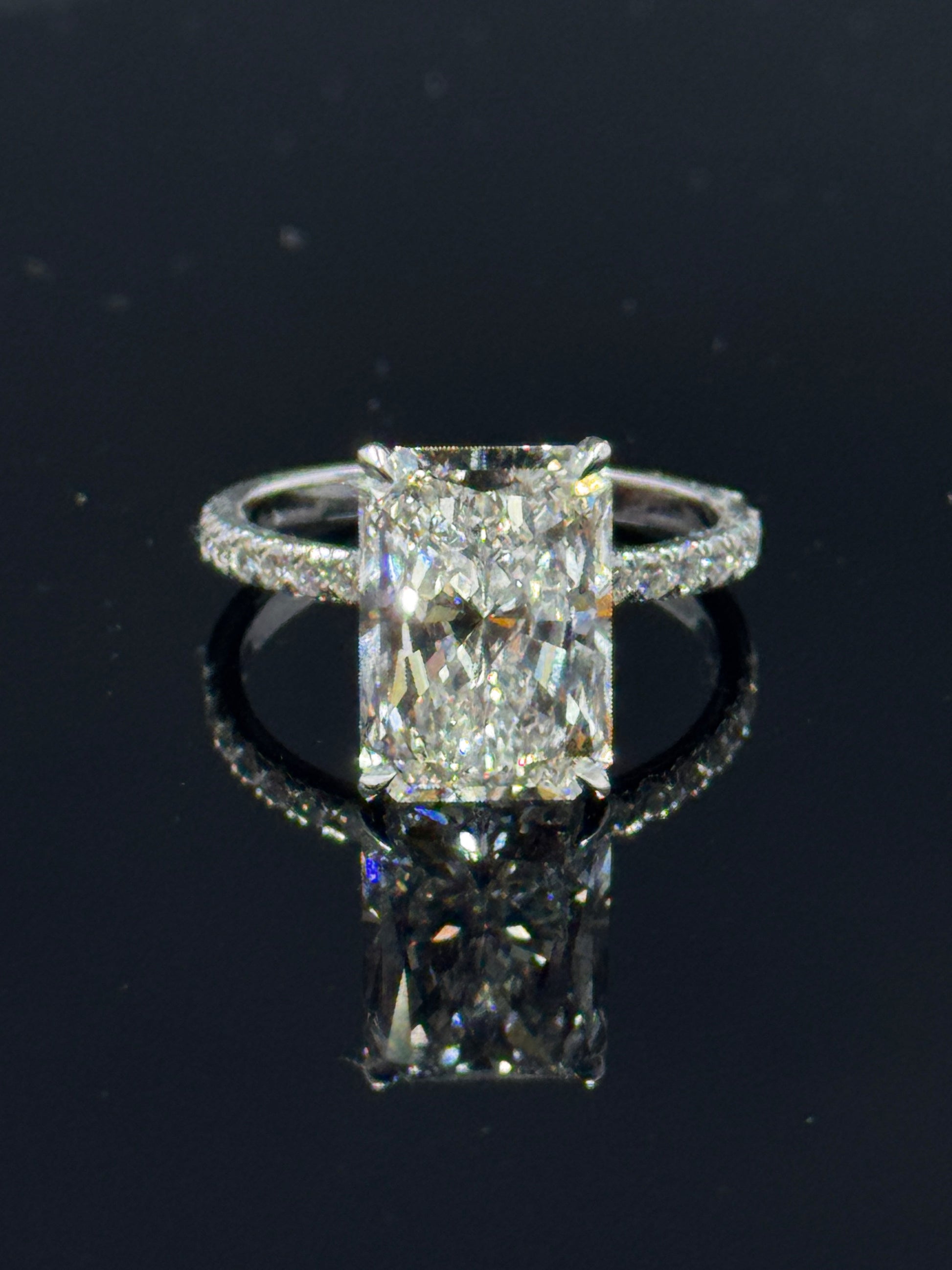 A refined modern classic — this radiant-cut diamond engagement ring is crafted in sleek 14k white gold with a half-coverage accented band and a choker-style hidden halo for extra brilliance. Designed to highlight the radiant center, the details add a touch of sparkle without taking away from the bold centerpiece. The centerpiece is a certified 5.08ct radiant-cut lab-grown diamond , graded F VS1 with Excellent polish, Excellent symmetry, and None fluorescence (IGI #651494990). The hidden halo and diamond accents on the shank create a radiant effect from every angle. Metal: 14k White Gold Center Stone: 5.08ct Radiant-Cut Lab-Grown Diamond (F VS1, EX/EX, None) Certification: IGI 651494990 Setting Style: Half-coverage band with choker-style hidden halo and accents Ring Size: 7 A sophisticated engagement ring that combines modern flair with timeless white gold brilliance. ✨ Ethically grown. Expertly crafted. Forever brilliant.