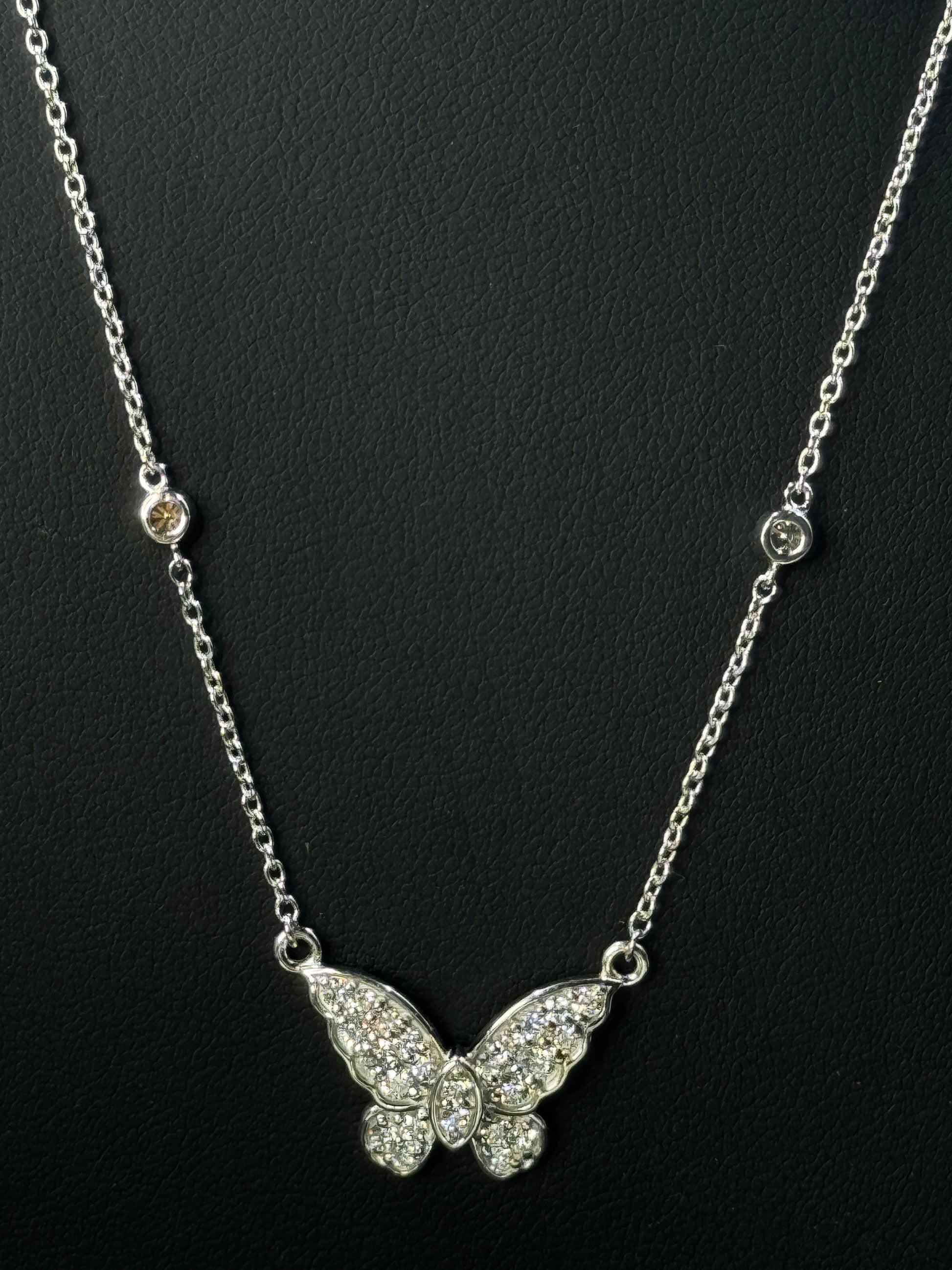 Delicate and radiant — this butterfly station necklace is crafted in .925 sterling silver and adorned with 1.00 carat of F color, VS1 lab-grown diamonds . Designed with sparkling butterfly accents evenly spaced along an 18-inch chain , this piece blends playful charm with timeless elegance. Metal: .925 Sterling Silver Length: 18 inches Total Carat Weight: 1.00 ctw Stone Type: Lab-Grown Diamonds Color/Clarity: F color, VS1 Design: Butterfly station necklace A graceful necklace that captures lightness and brilliance — perfect for layering or wearing as a whimsical statement. ✨ Ethically grown. Expertly crafted. Forever brilliant.