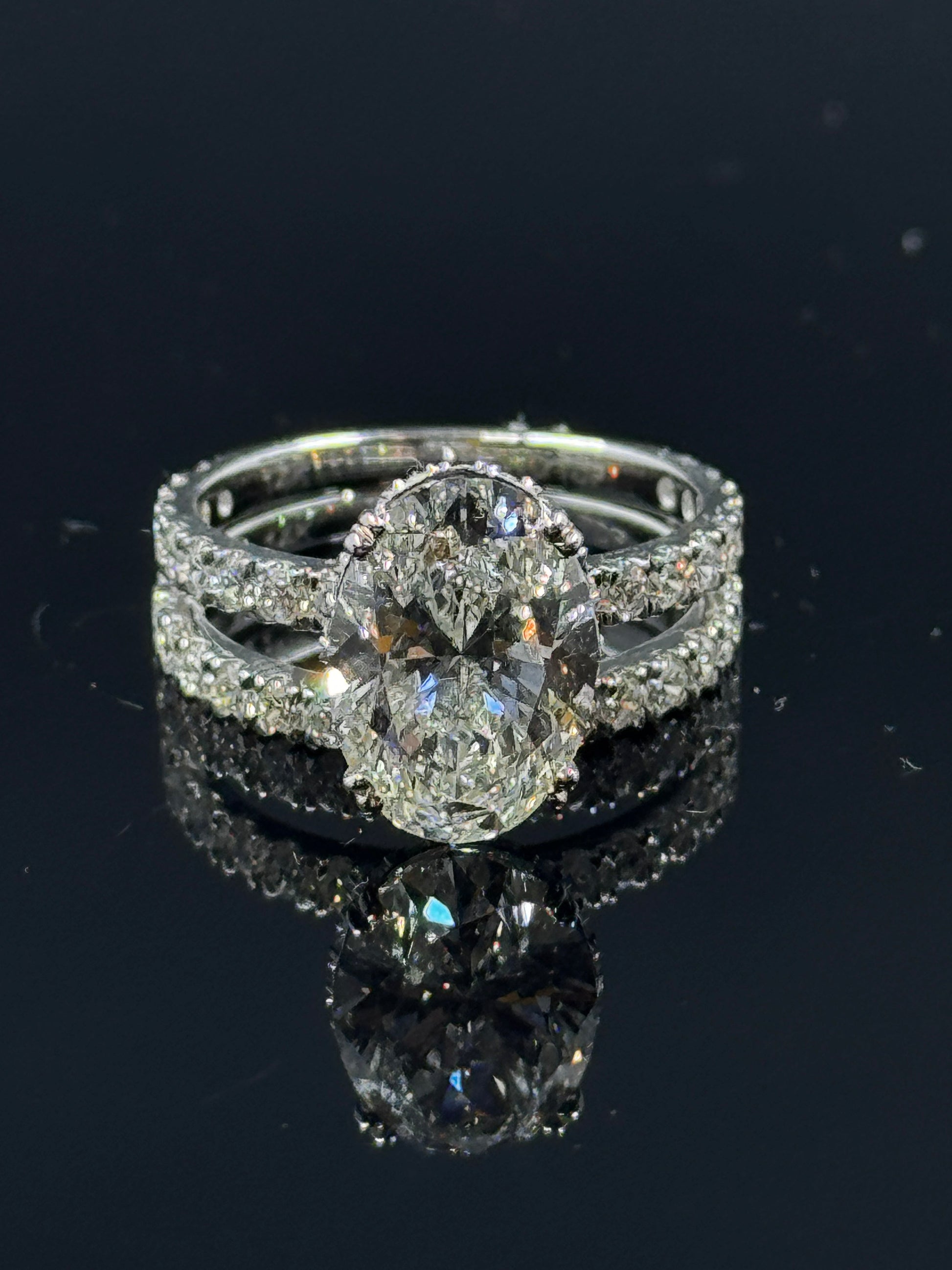 Timeless elegance with modern brilliance — this oval-cut diamond bridal set features an engagement ring paired with a perfectly matched eternity band, crafted in 14k white gold (4.99g). A design that combines soft curves with radiant sparkle. At its heart is a certified 3.66ct oval-cut lab-grown diamond , graded F VS1 with Excellent polish, Excellent symmetry, and None fluorescence (IGI #561264884). Complemented by 1.80ctw of side stones , the total weight of this bridal set reaches an impressive 5.46ctw . Metal: 14k White Gold (4.99g) Center Stone: 3.66ct Oval-Cut Lab-Grown Diamond (F VS1, EX/EX, None) Certification: IGI 561264884 Side Stones: 1.80ctw lab-grown diamonds Total Carat Weight: 5.46ctw Ring Size: 7 Design: Engagement ring with matching eternity band With graceful curves and endless brilliance, this bridal set is perfect for those who want classic romance with a modern touch. ✨ Ethically grown. Expertly crafted. Forever brilliant.