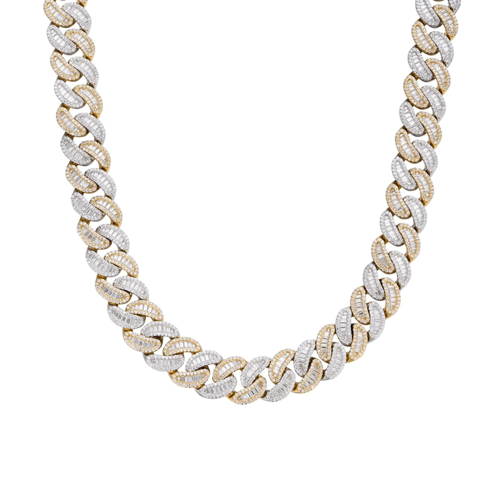 Sterling Silver Round 15mm Moissanite Round and Baguette in Centre Cuban 22 Inch Necklace RP+GP 40-1/5 Cttw — crafted for everyday wear and standout style. Made by Royal Jewelry Wholesale, known for quality materials and reliable craftsmanship. Comfortable, durable, and easy to gift — ready to ship from our Tulsa-based shop. Popular tags: necklace, silver, Sterling.